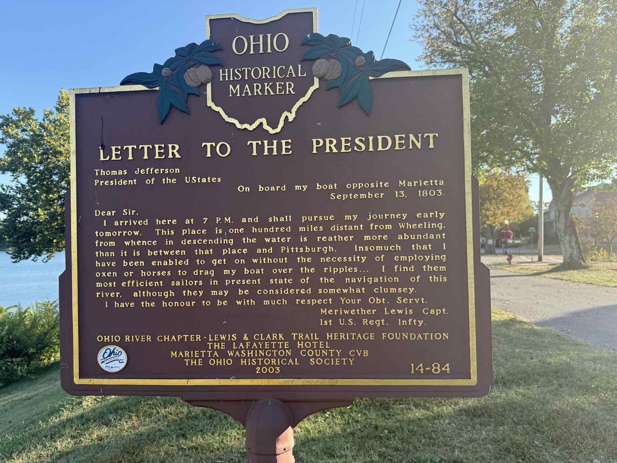 Take the marker above, for example. On September 13, 1803, Meriwether Lewis — yes, of the famed Lewis and Clark expedition — paused opposite Marietta, Ohio, and wrote a letter to President Thomas Jefferson. He described the Ohio River, its challenges, and its promise as he prepared to head deeper into the journey that would chart a course across the continent.