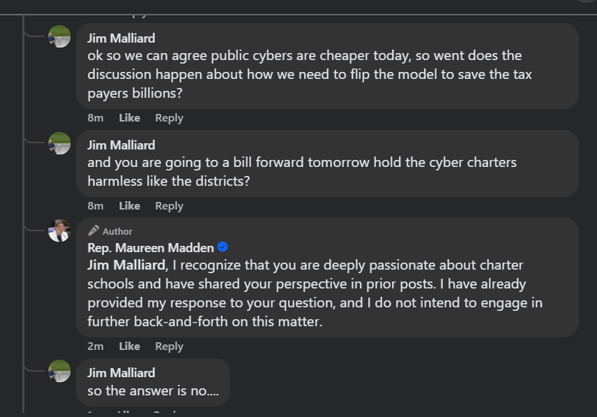 I asked one lawmaker if cyber schools could at least be held harmless — meaning, no additional cuts in the next budget.